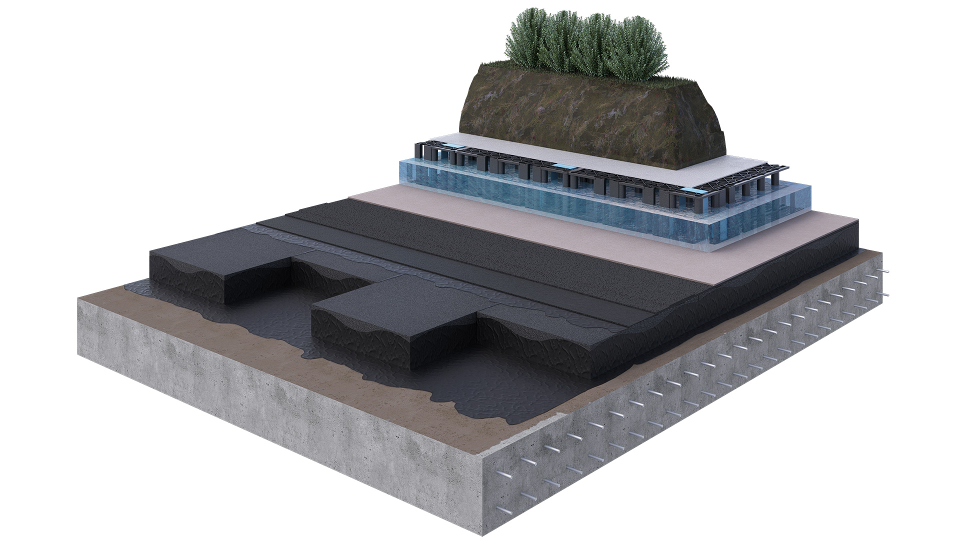 Uno strato di terra spesso 50 cm pesa circa 1.000 kg/m², mentre un vaso da 1 m³ per singolo albero pesa circa 2.500 kg. Considerando questi carichi, è evidente quanto sia fondamentale fornire al tetto verde un supporto resistente e indeformabile per evitare danni ai manti di tenuta, avvallamenti nel terreno e malfunzionamenti dei sistemi di ritenzione dell’acqua. L’isolamento termico FOAMGLAS® può resistere a carichi di compressione elevati, sopportandoli in modo permanente e sicuro, senza deformarsi e compromettere le sue proprietà isolanti. La struttura a celle di vetro chiuse rende l’isolante FOAMGLAS® resistente a qualsiasi tipo di deformazione (EN 826 Allegato A), favorendo la durata dell’impermeabilizzazione nel tempo.
