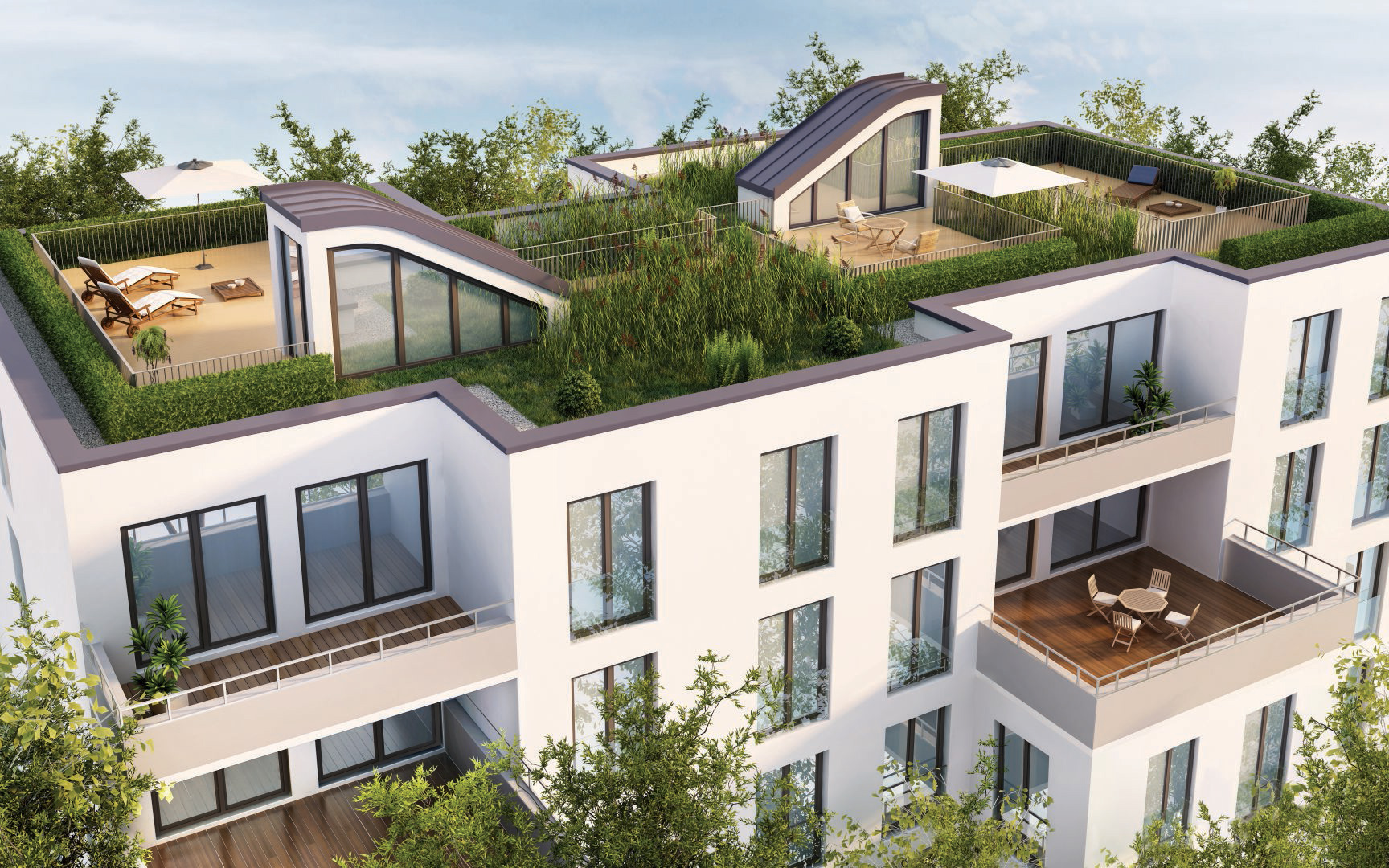 • Un tetto verde intensivo costituito da una vegetazione variegata e da sistemi supplementari di ritenzioni idrica.